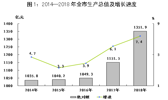 初步核算,全年全市生產(chǎn)總值1351.9億元,按可比價(jià)格計(jì)算,比上年增長(zhǎng)7.4%。其中,第一產(chǎn)業(yè)增加值49.2億元,增長(zhǎng)0.3%,占生產(chǎn)總值的比重為3.6%;第二產(chǎn)業(yè)增加值717.9億元,增長(zhǎng)7.2%,占生產(chǎn)總值的比重為53.1%;第三產(chǎn)業(yè)增加值584.8億元,增長(zhǎng)8.5%,占生產(chǎn)總值的比重為43.3%。第三產(chǎn)業(yè)中,金融保險(xiǎn)業(yè)增加值86.8億元,增長(zhǎng)8.0%;交通運(yùn)輸、倉(cāng)儲(chǔ)和郵政業(yè)增加值100.9億元,增長(zhǎng)5.9%;批發(fā)和零售業(yè)增加值68.2億元,增長(zhǎng)3.2%;住宿和餐飲業(yè)增加值37.5億元,增長(zhǎng)6.7%;營(yíng)利性服務(wù)業(yè)增加值82.6億元,增長(zhǎng)23.8%。人均地區(qū)生產(chǎn)總值57819元,按2018年平均匯率計(jì)算為8737美元。