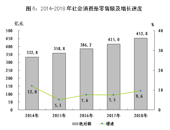 全年全市社會(huì)消費(fèi)品零售總額452.8億元,增長(zhǎng)9.6%。按經(jīng)營(yíng)地統(tǒng)計(jì),城鎮(zhèn)消費(fèi)品零售額383.9億元,增長(zhǎng)9.1%;鄉(xiāng)村消費(fèi)品零售額68.9億元,增長(zhǎng)12.4%。