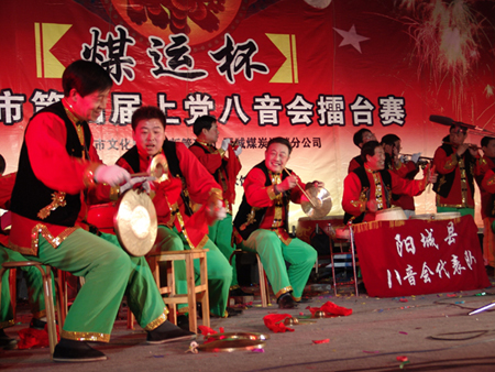 在山西省東南部晉城市六縣(市區(qū))廣為流傳。八音,即我國古代民族樂器的統(tǒng)稱,指金、石、土、革、絲、木、匏、竹八類;八音會是民間組織的音樂班子,主要使用鼓、鑼、鈸、旋、笙、簫、笛、管等八種樂器。故名八音會。