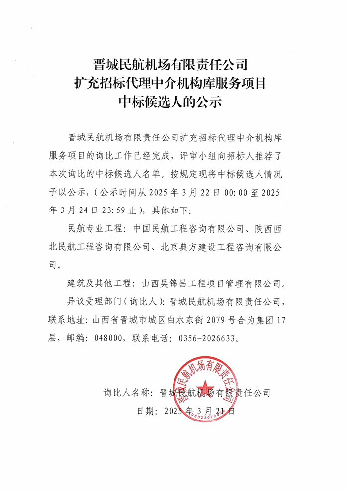 晉城民航機(jī)場有限責(zé)任公司擴(kuò)充招標(biāo)代理中介機(jī)構(gòu)庫服務(wù)項目中標(biāo)候選人的公示